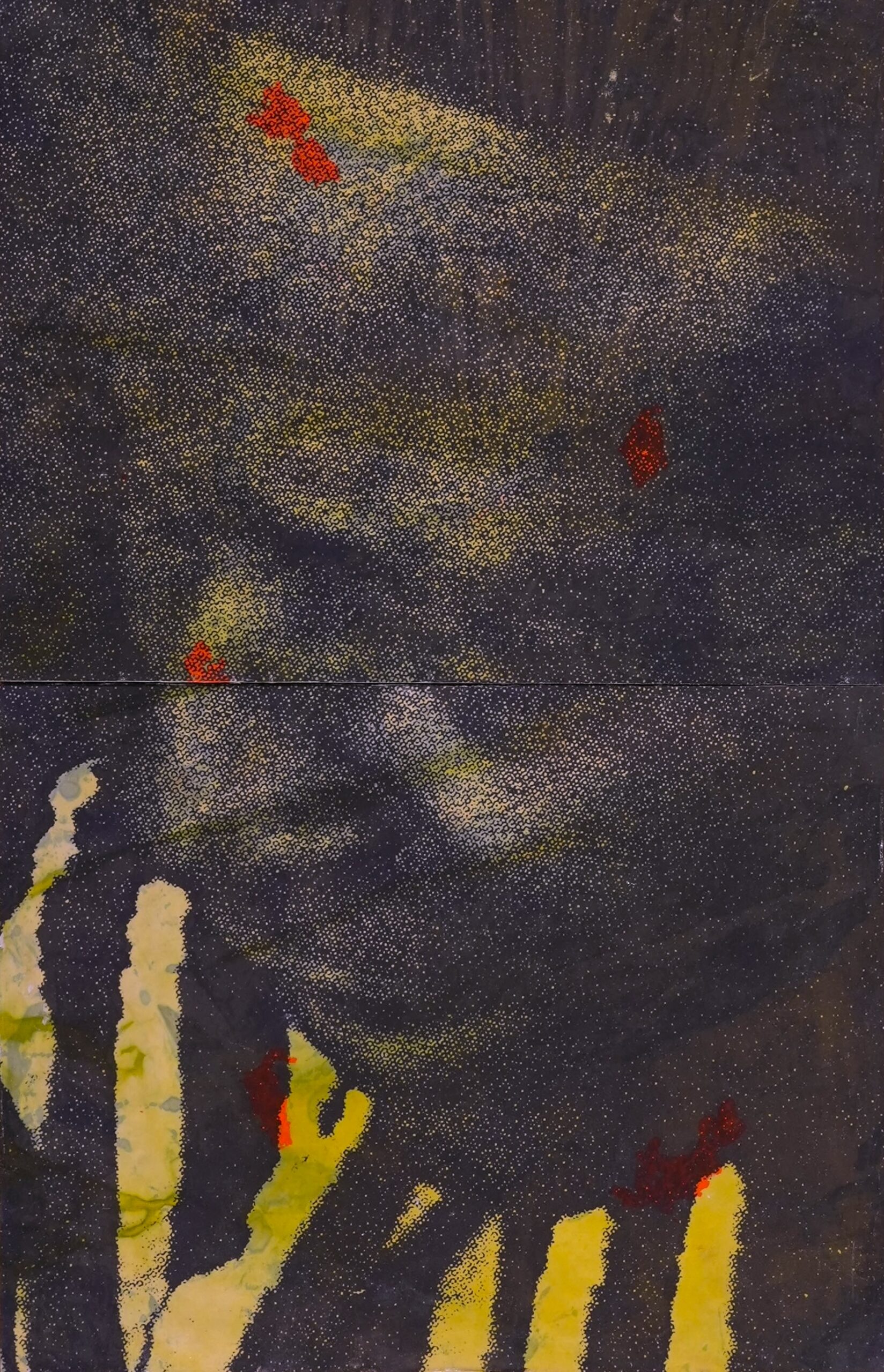 Scanned photo transfer on acrylic-dyed fabric, spray paint